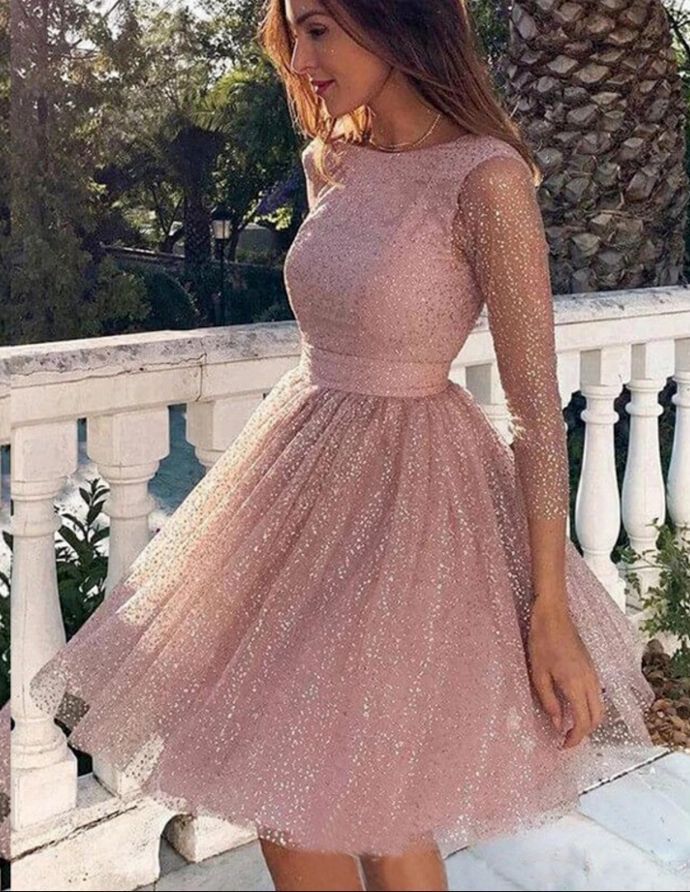 Fashion pink long sleeves midi dress,jewel lace sequins short homecoming dress ,SB122