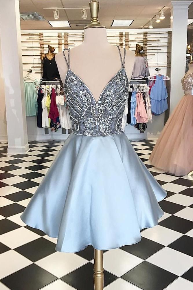 Blue sleeveless spaghetti-straps homecoming dress,v-neck beaded satin short school event dress,SB146
