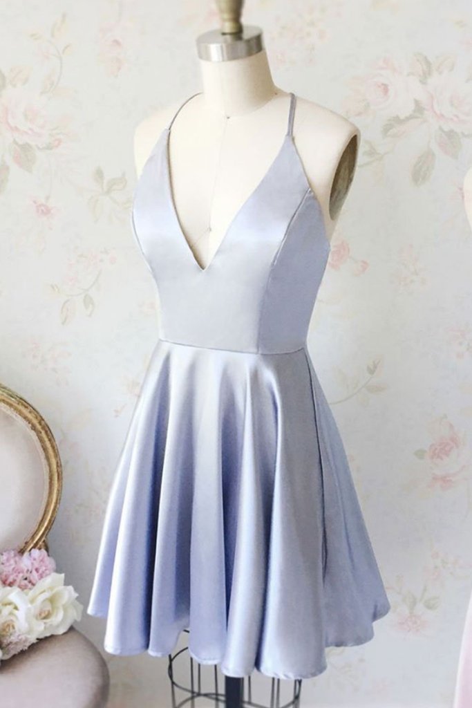 Blue sleeveless v-neck short school event dress,halter satin spaghetti-straps homecoming dress,SB148