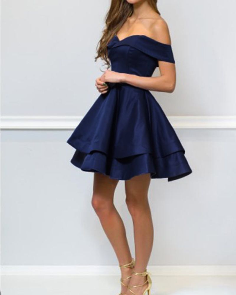 Blue off the shoulder homecoming dress,v-neck satin ruffles short school event dress,SB149
