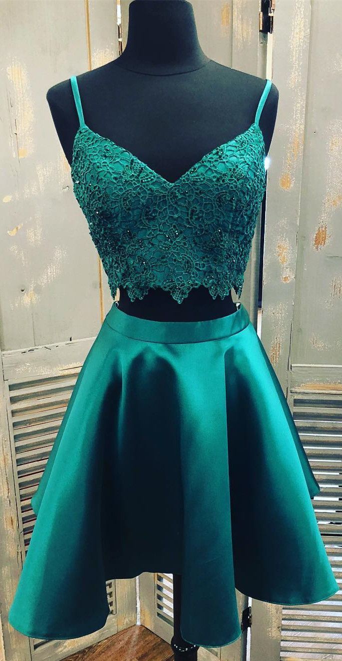 two piece green v-neck homecoming dress,applique spaghetti-straps satin school event dress,SB0171