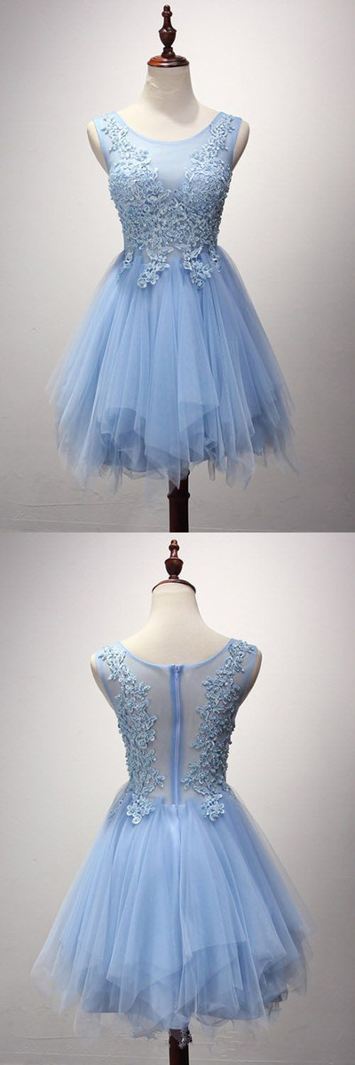 beautiful blue lace sheer-straps short fanshion dress,applique tulle homecoming dress,SB0555