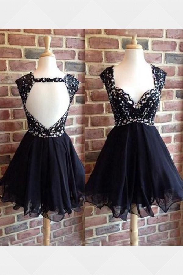 black applique short fanshion dress,midi dress,v-neck tulle short sleeves homecoming dress,SB0565