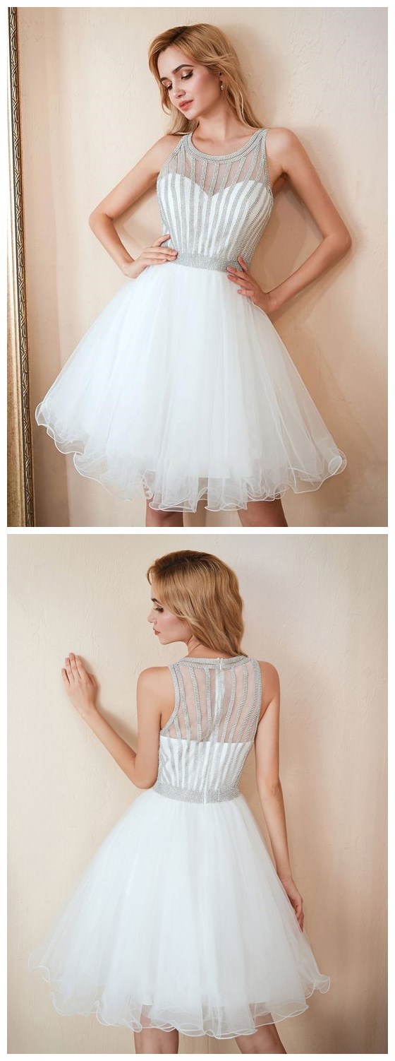 white halter tulle short fanshion dress,midi dress,women dress,sleeveless beaded sweetheart homecoming dress,SB0567