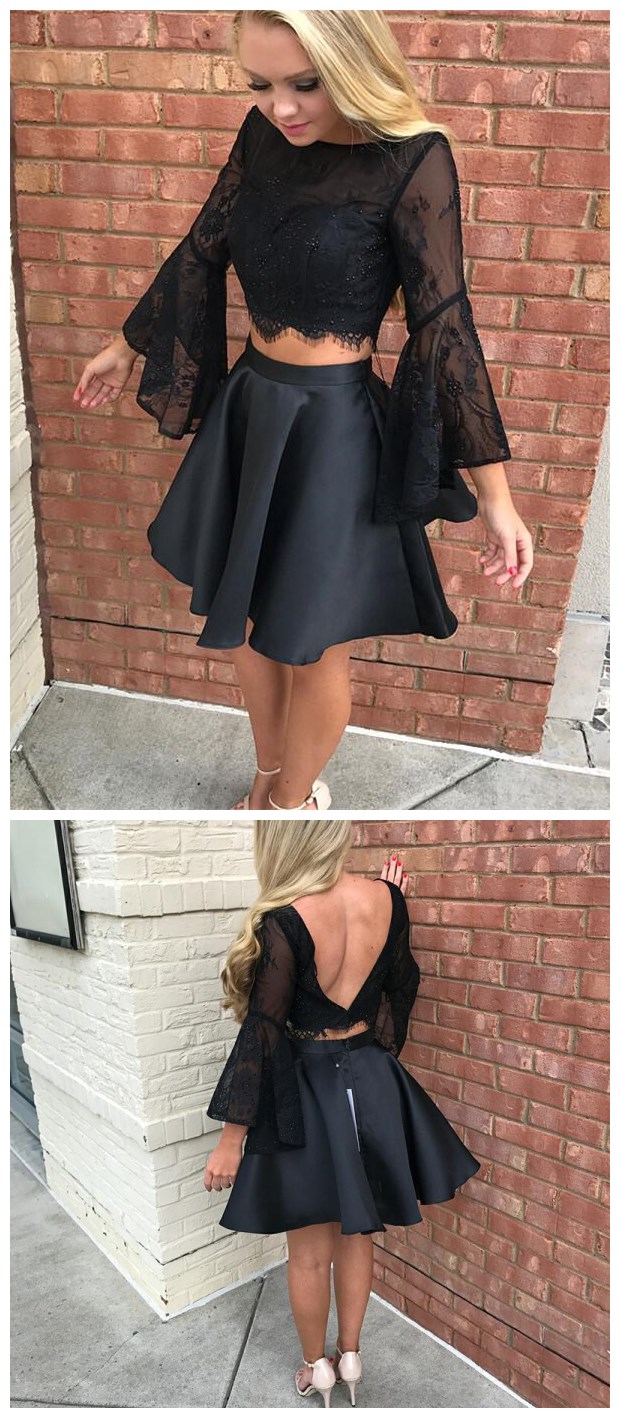 two piece black long sleeves fanshion dress,midi dress,women dress,applique lace satin homecoming dress,SB0572