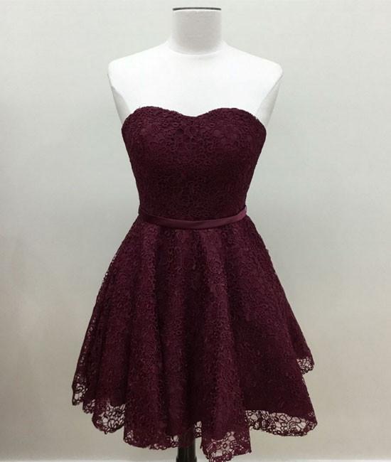 burgundy sleeveless sweetheart fanshion dress,midi dress,applique lace homecoming dress,SB0583