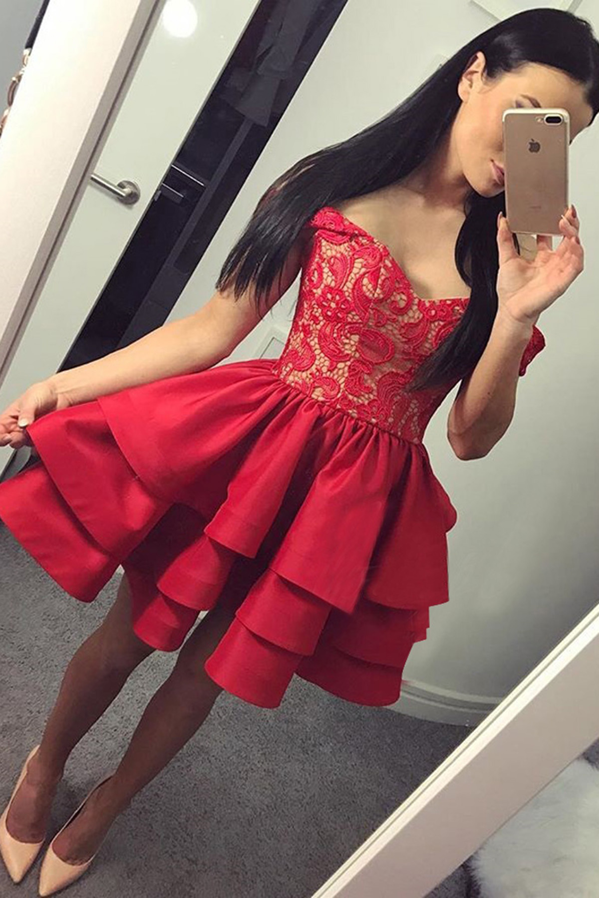 red off the shoulder v-neck fanshion dress,midi dress,applique lace satin homecoming dress,SB0587