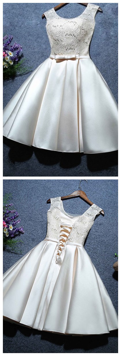 white satin fanshion dress,midi dress,sleeveless lace jewel applique homecoming dress,SB0590