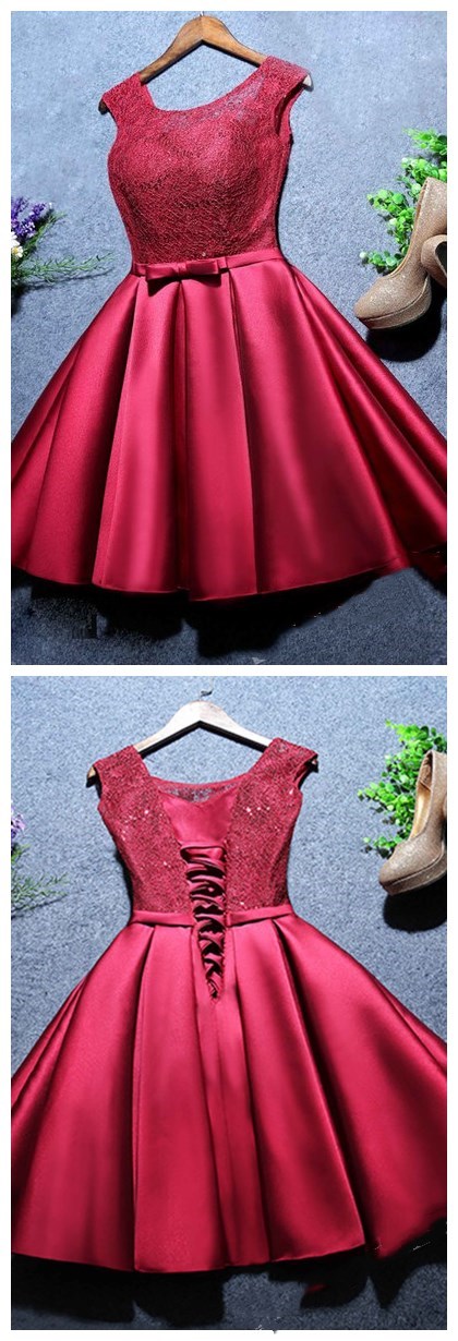burgundy sleeveless short fanshion dress,midi dress,applique lace satin jewel homecoming dress,SB0591