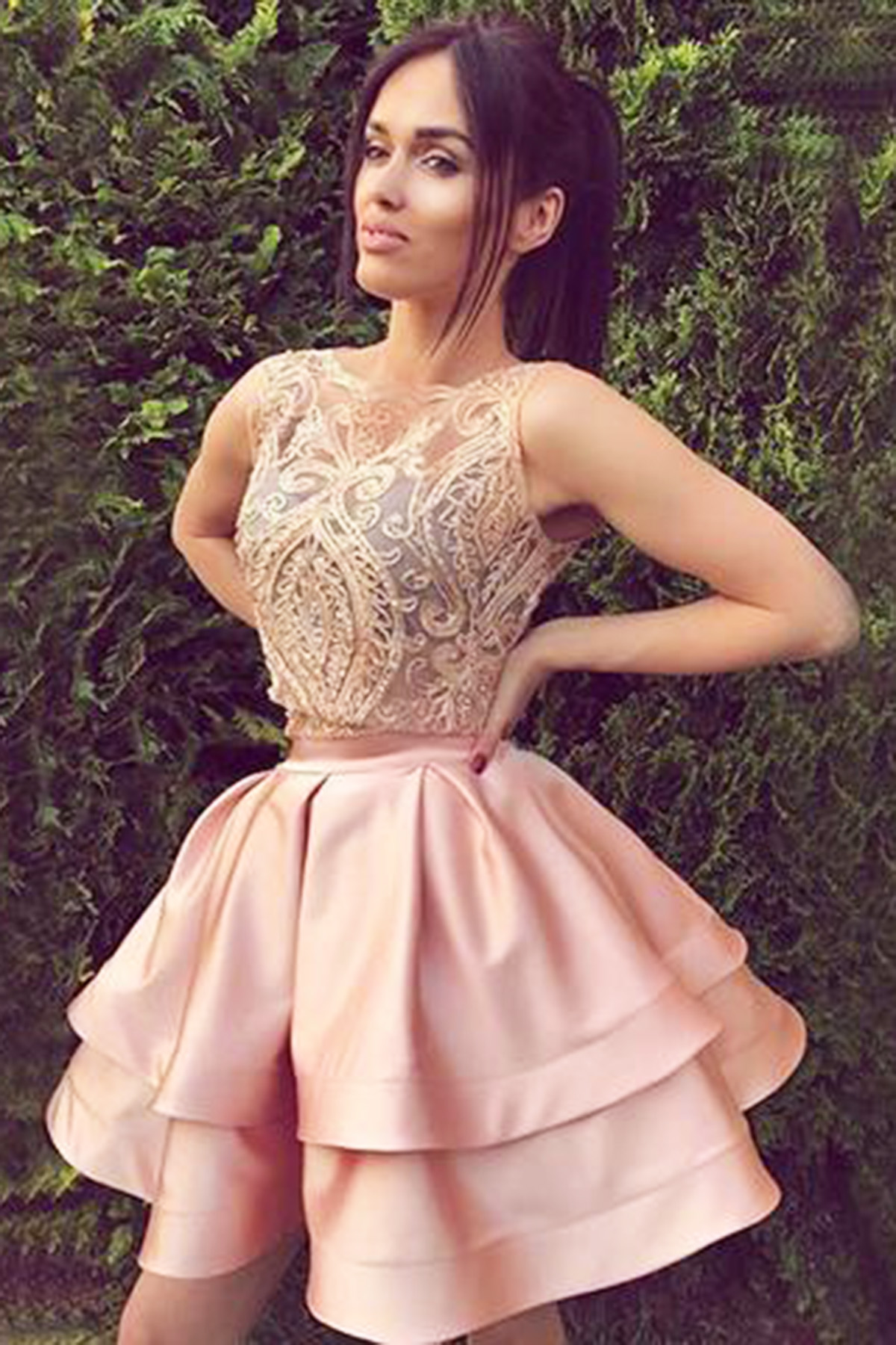 two piece pink lace fanshion dress,midi dress,sleeveless satin jewel homecoming dress,SB0593