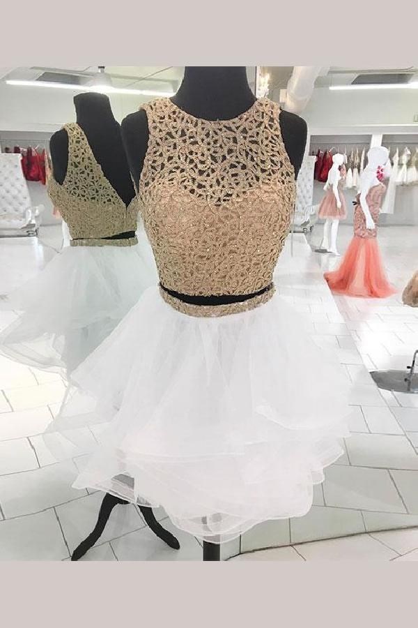 two piece white tulle fanshion dress,midi dress,beaded halter sleeveless sweetheart homecoming dress,SB0597