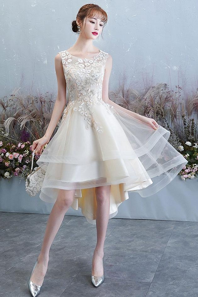champagne tulle applique lace mini fanshion dress,midi dress,jewel sleeveless homecoming dress,SB0606