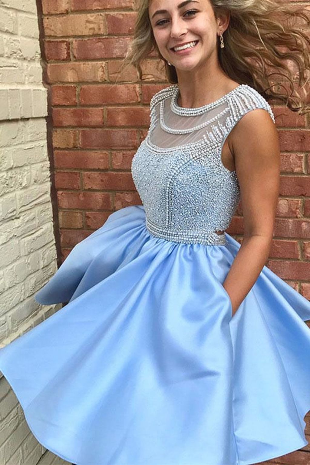 blue sleeveless satin fanshion dress,midi dress,beaded pocket lace homecoming dress,SB0607