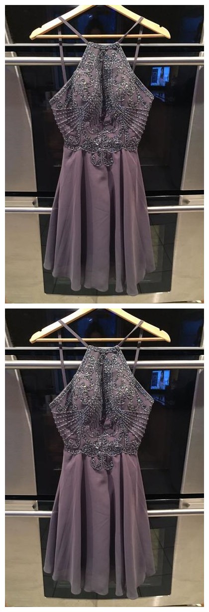 sexy gray sleeveless mini fanshion dress,midi dress,beaded spaghetti-straps chiffon backless homecoming dress,SB0608