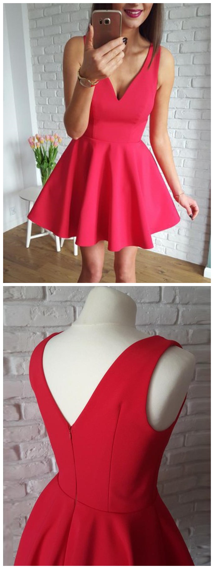 red sleeveless short fanshion dress,v-neck satin homecoming dress,SB0231