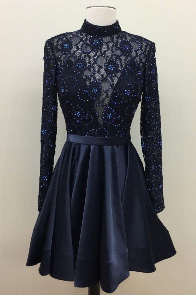 blue long sleeves jewel fanshion dress,applique lace satin beaded v-neck homecoming dress,SB0235