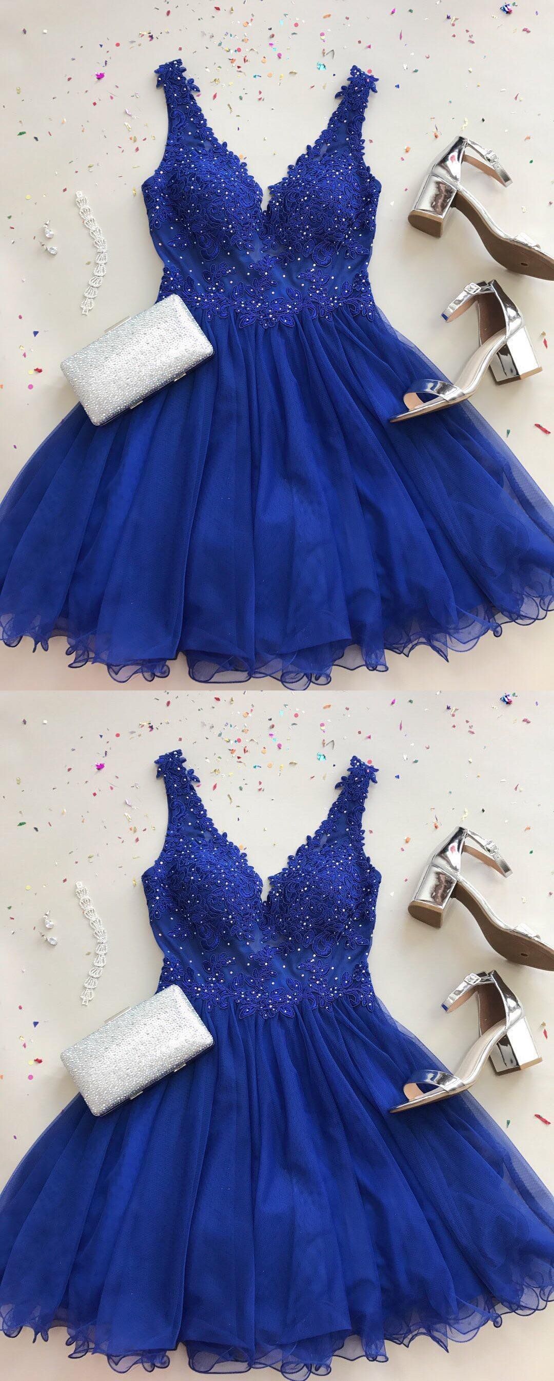 blue v-neck applique tulle fanshion dress,midi dress,beaded chiffon homecoming dress,SB0236