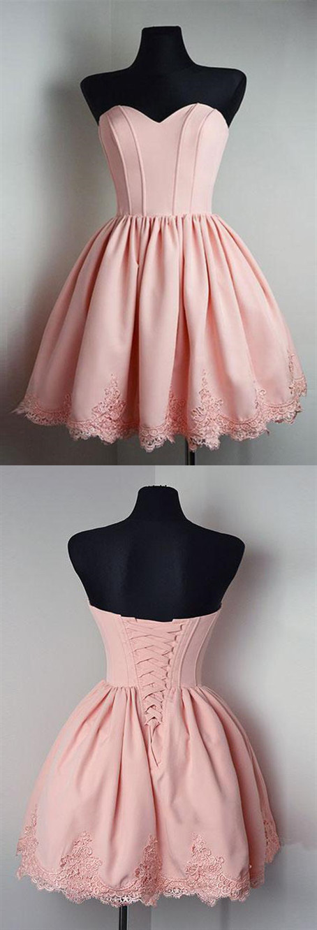 pink sleeveless strapless sweetheart short fanshion dress,applique satin homecoming dress,SB0253