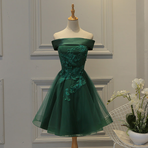 SB0703,cute dark green off the shoulder cap sleeves strapless applique beaded tulle satin homecoming dress