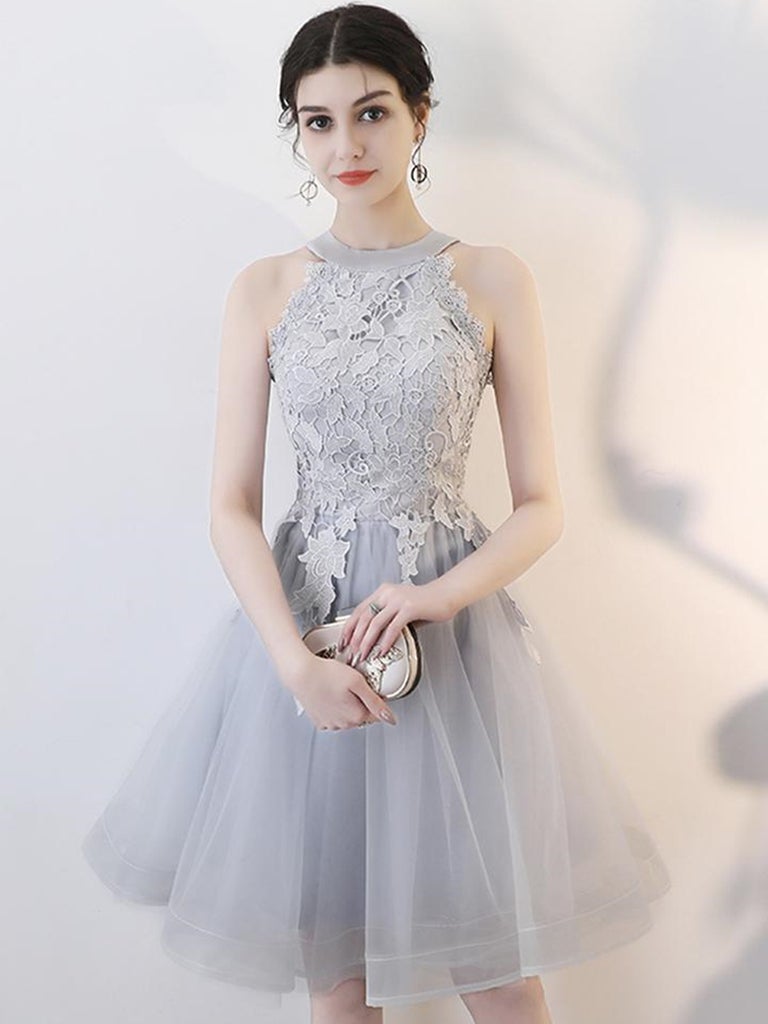 SB0721,Off Shoulder Short Grey Lace Prom Dresses, Grey Lace Formal Graduation Homecoming Dresses