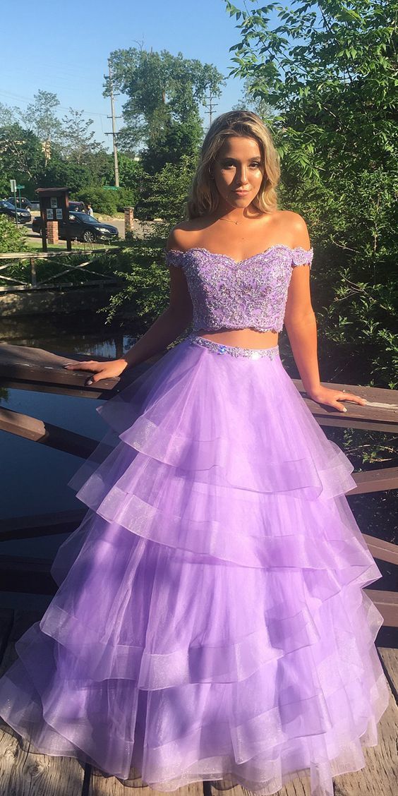 Two piece tulle lace prom dresses applique off the shoulder beaded floor length prom dresses,SB018