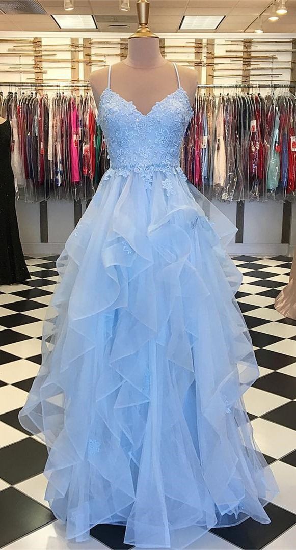 Blue sleeveless prom dress,applique spaghetti-straps v-neck evening dress,tulle lace ruffles party dress,SB070
