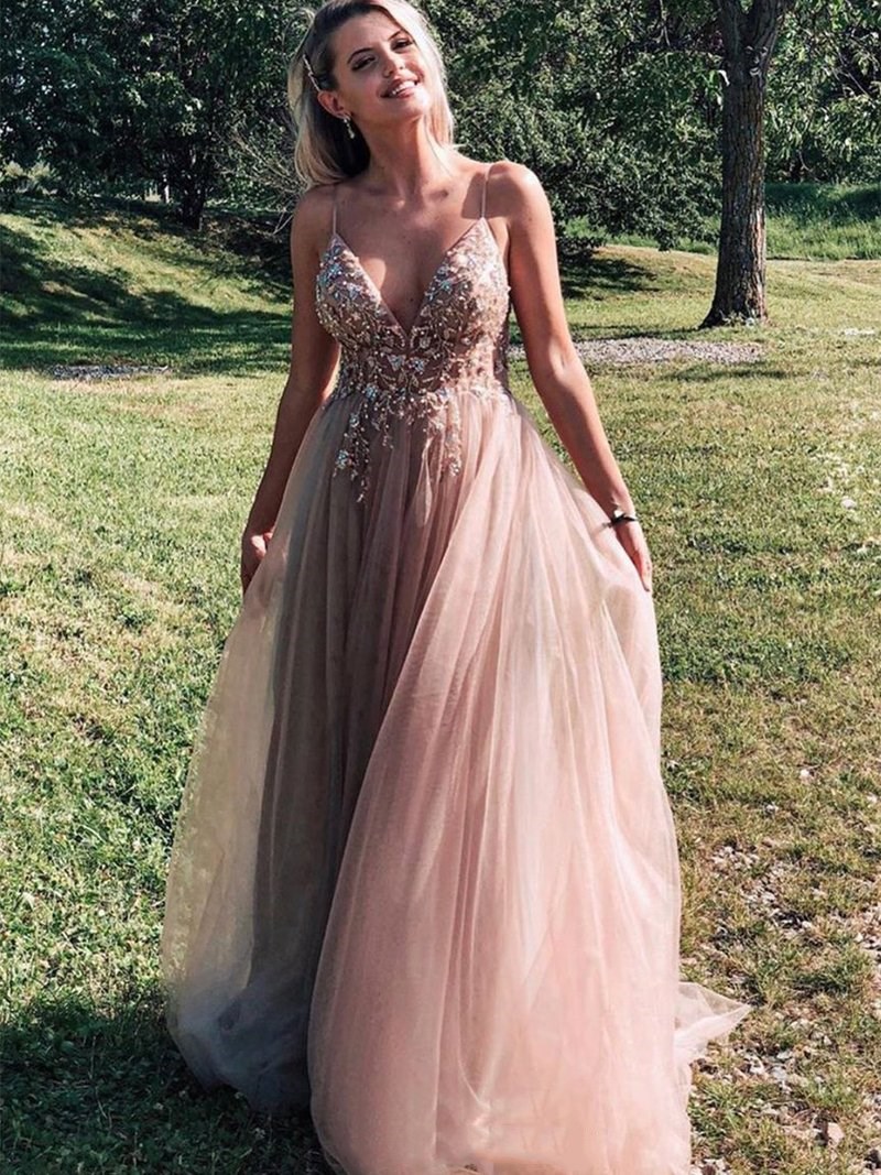 champagne tulle lace prom dress,beaded spaghetti-straps v-neck evening dress,SB075