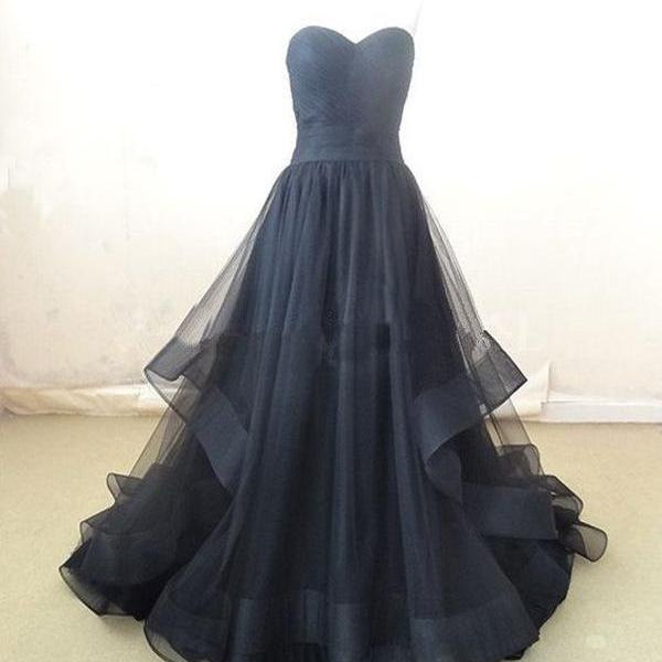 black strapless sweetheart prom dress,sleeveless tulle ruffles long evening dress,SB091