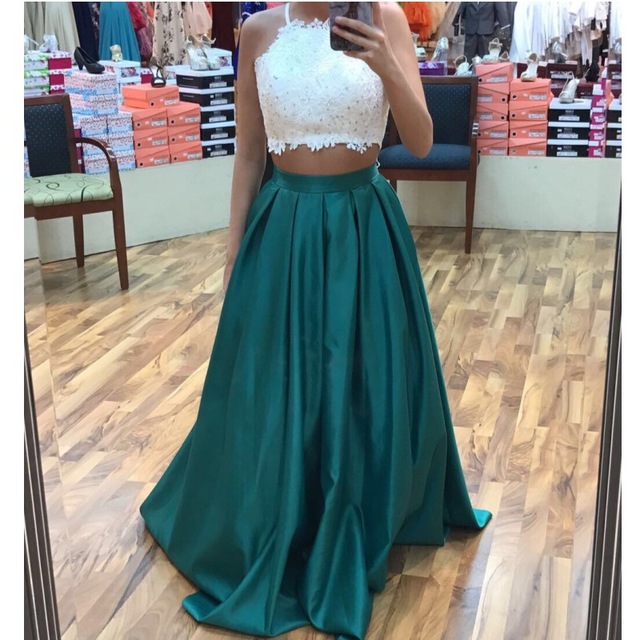 Two piece white applique long prom dresses green satin sleeveless halter evening dresses,SB117