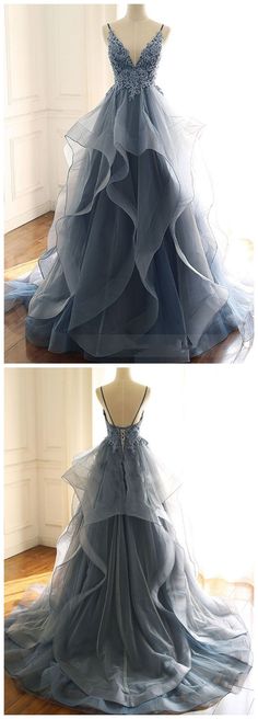 gray sleeveless applique tulle v-neck spaghetti-straps backless prom dress,SB0206
