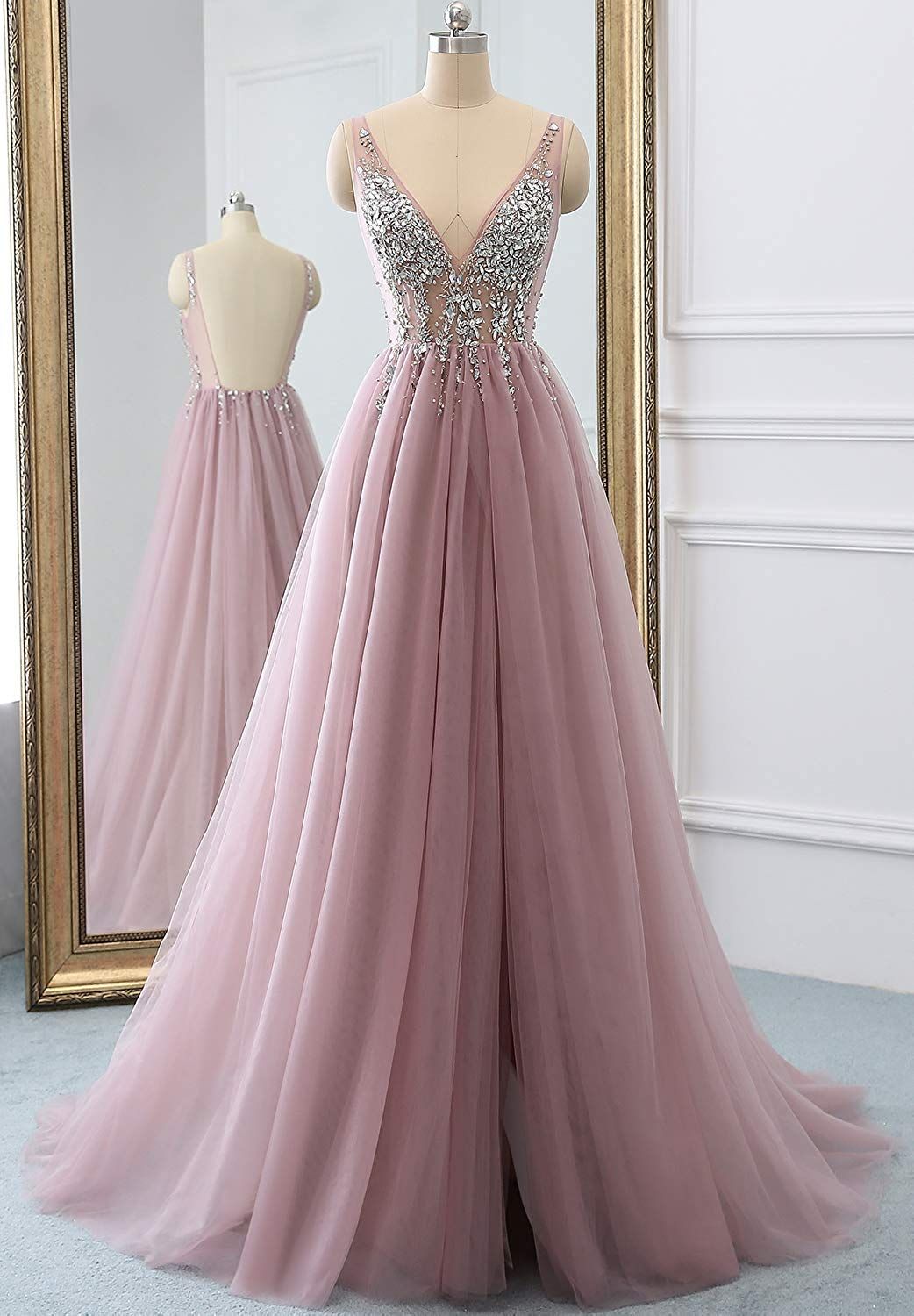 pink sleeveless prom dress,v-neck backless lace tulle beaded long evening dress,SB0302