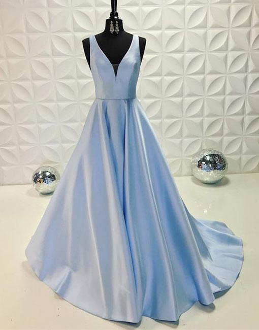 simple blue sleeveless satin long prom dresses,v-neck full length evening dress,SB0304