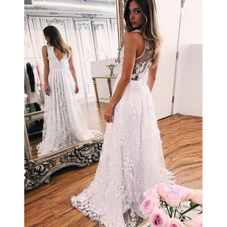 white v-neck sleeveless prom dresses,tulle lace applique long evening dress,SB0312