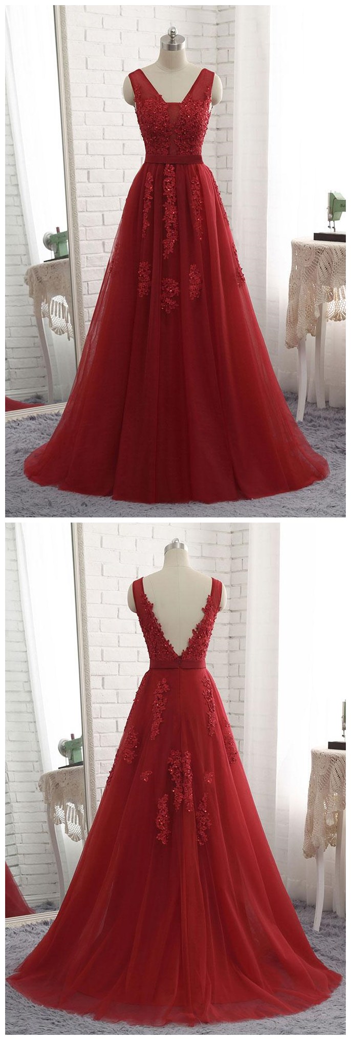 red sleeveless backless prom dresses,applique tulle lace v-neck evening dress,SB0321