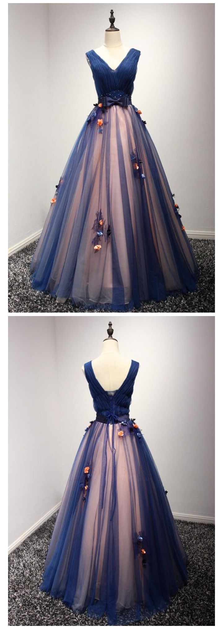 blue sleeveless v-neck prom dresses,applique tulle lace bow-knot evening dress with beaded,SB0322