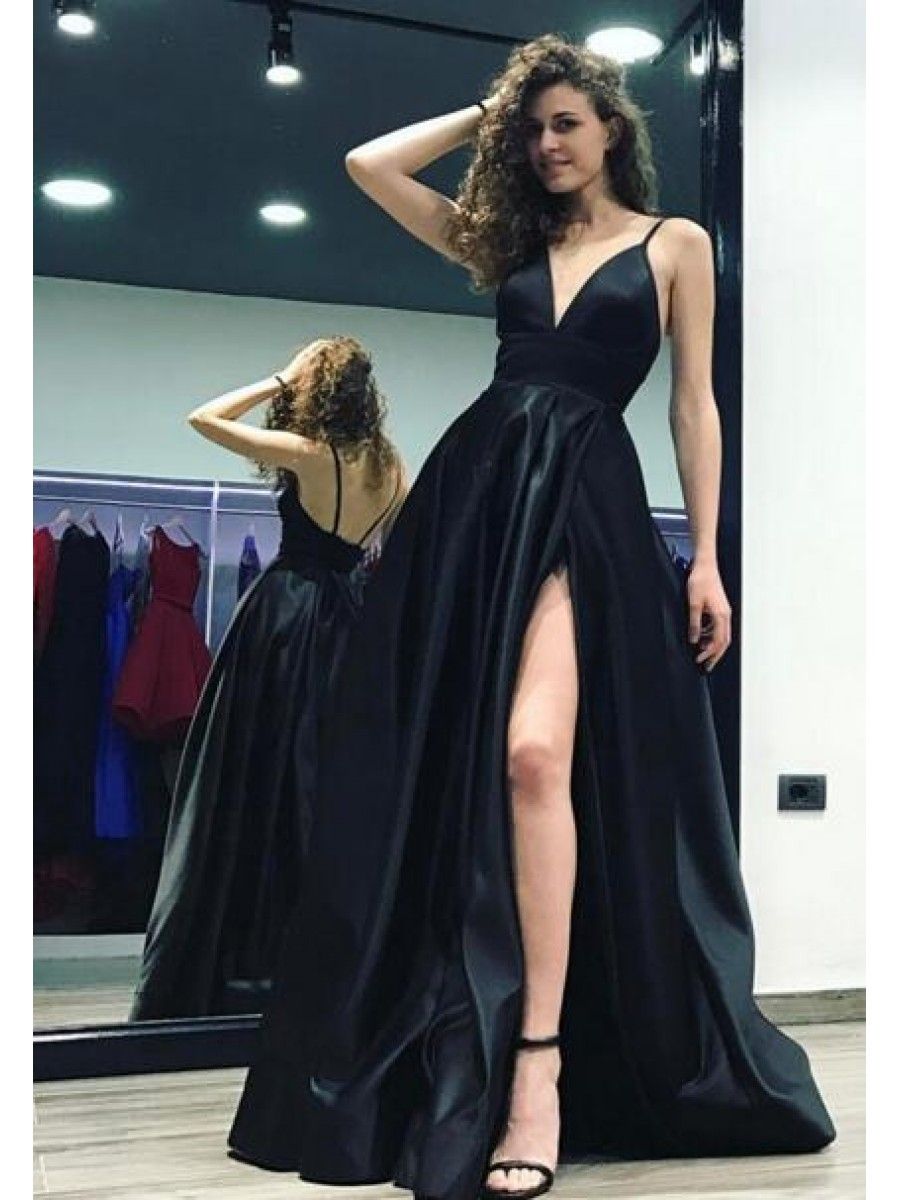 black sleeveless v-neck long prom dresses,satin spaghetti-straps slit-skirt evening dress,SB0329
