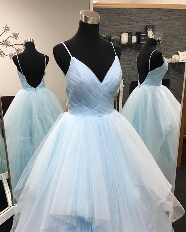 blue sleeveless v-neck prom dresses,spaghetti-straps backless tulle long evening dress,SB0359