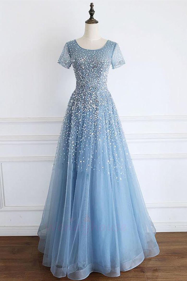 blue tulle jewel long prom dresses women dresses,tulle beaded short sleeves evening dress,SB0365