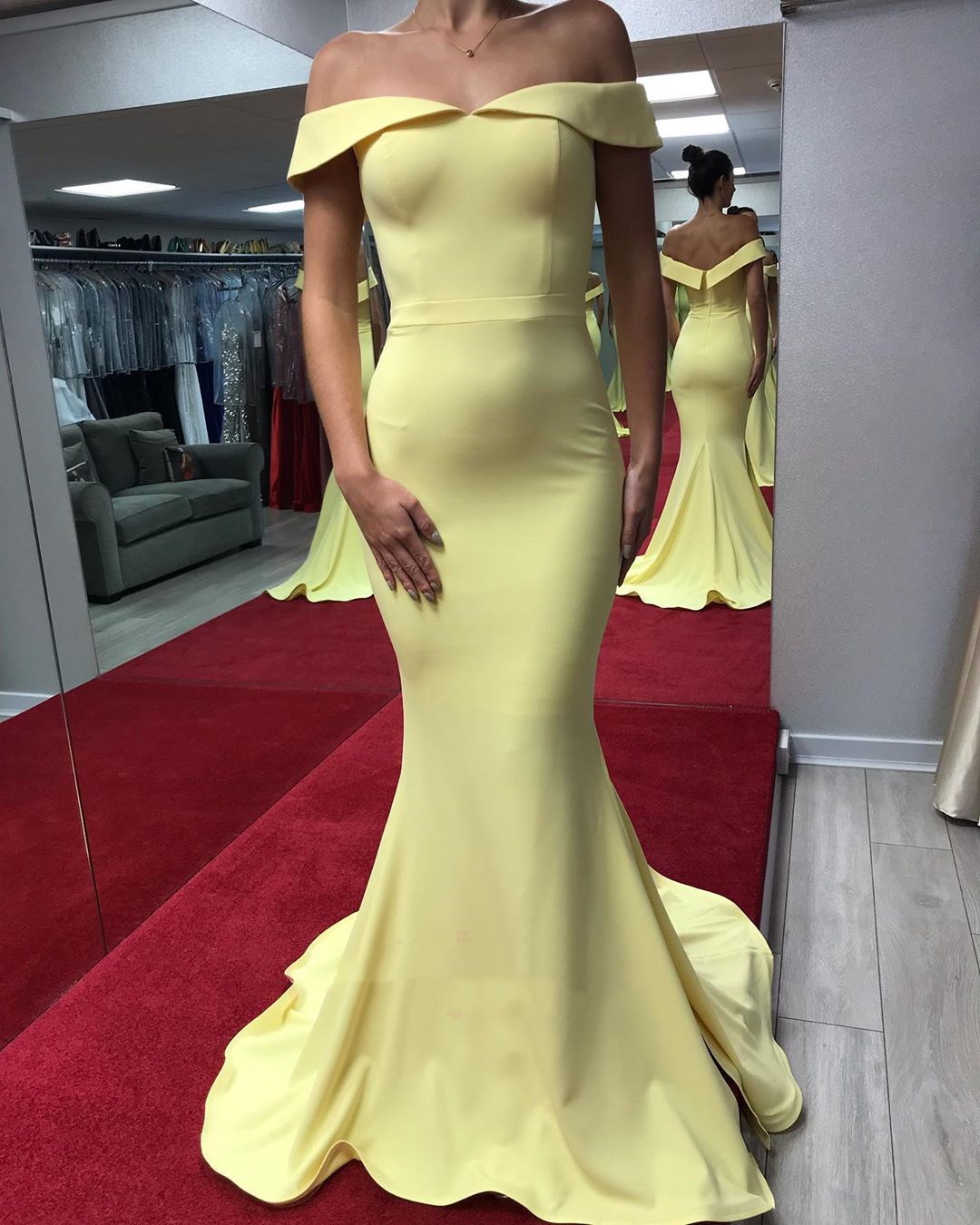 yellow off the shoulder evening dresses,short sleeves satin long prom dress,SB0380