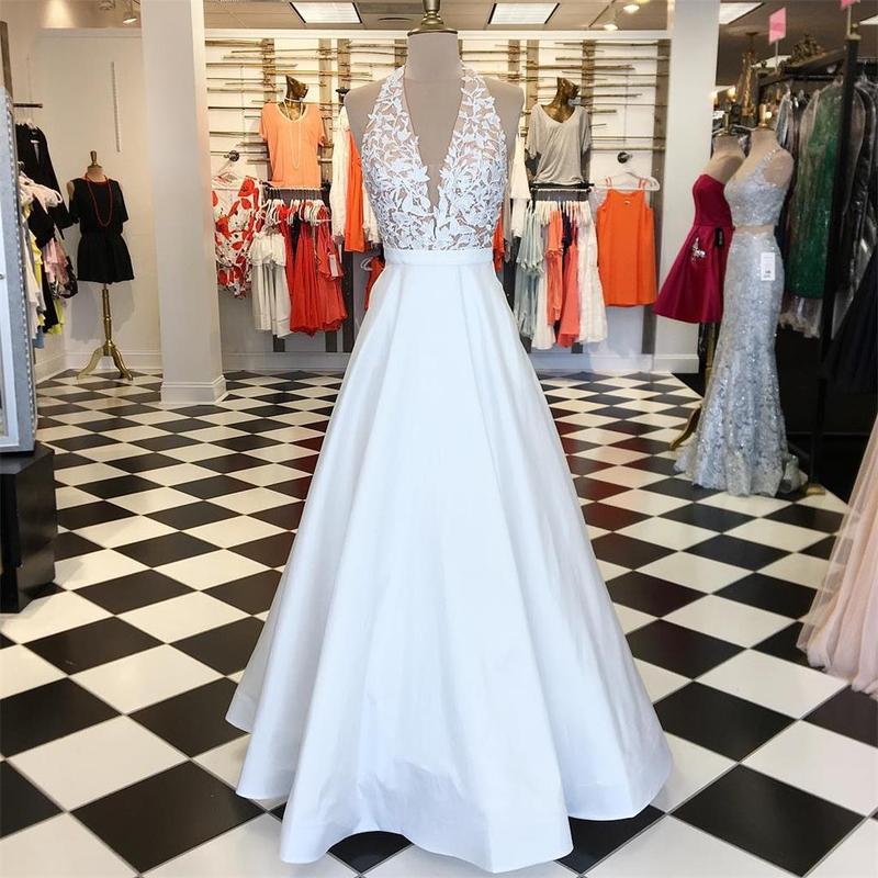 white applique halter prom dresses women dresses,satin lace evening dress,SB0383
