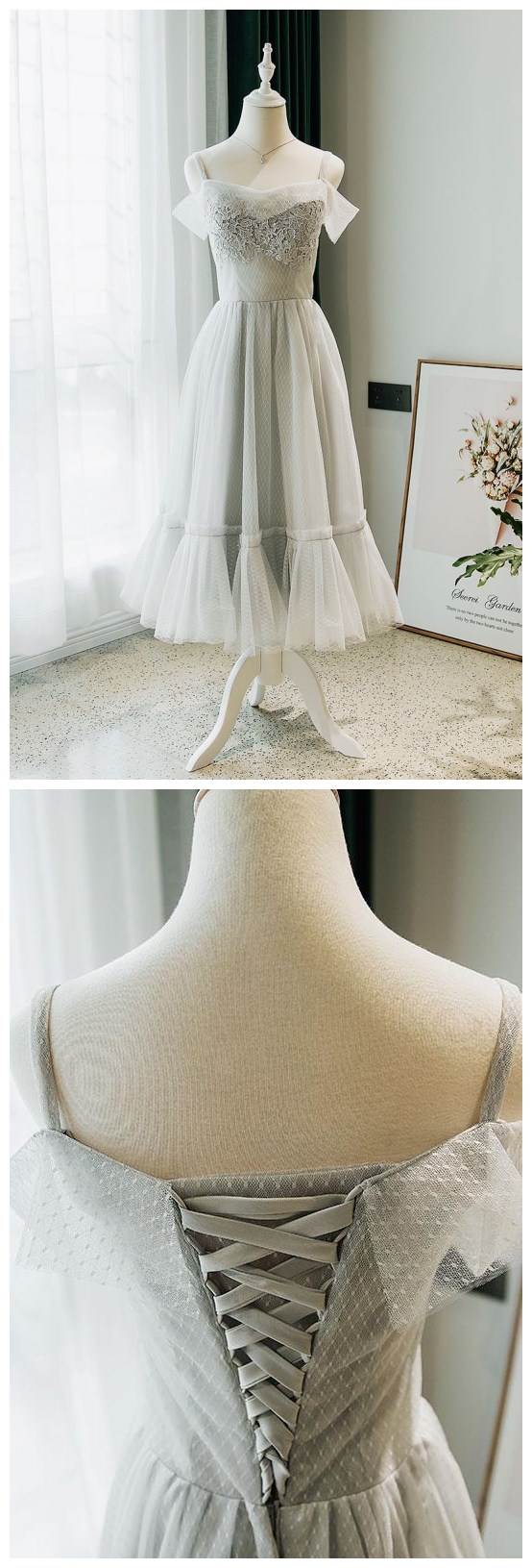gray off the shoulder tulle prom dresses spaghetti-straps v-neck applique tea length evening dress,SB0405