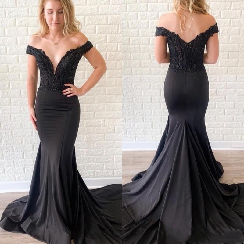 black v-neck satin prom dresses women dresses,applique off the shoulder short sleeves evening dress,SB0407