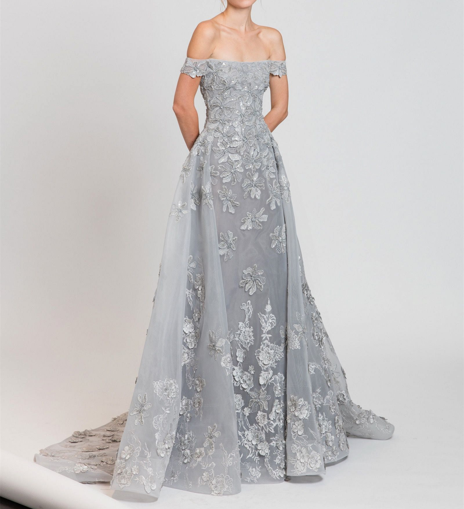 gray off the shoulder short sleeves prom dresses fashion dresses,strapless applique tulle evening dress,SB0430