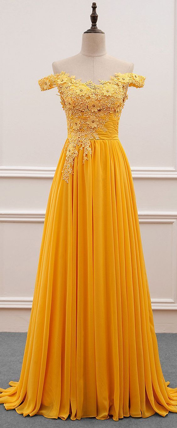 yellow off the shoulder v-neck prom dresses,applique chiffon evening dress,SB0443