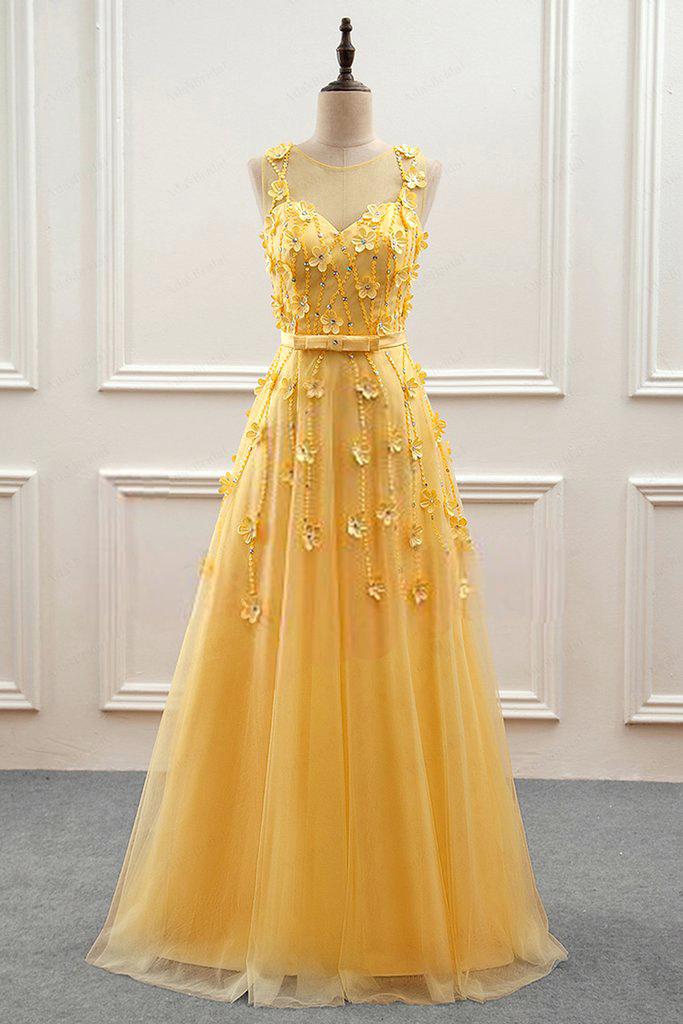 yellow sleeveless sweetheart jewel prom dresses women dresses,sheer-straps applique tulle evening dress,SB0461