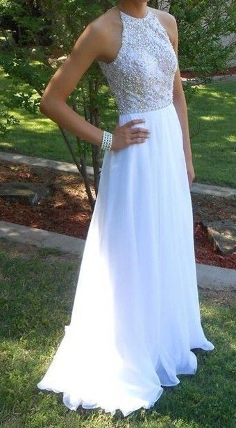 white chiffon prom dresses women dresses,halter sleeveless beaded evening dress,SB0475