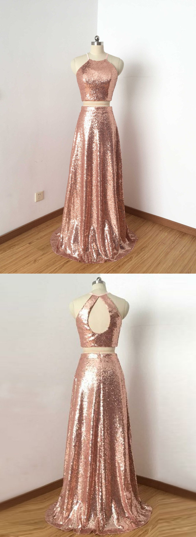 two piece light champagne sleeveless prom dresses women dresses,spaghetti-straps halter sequins evening dress,SB0476
