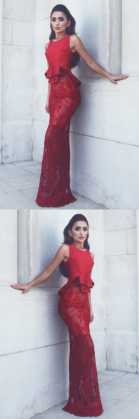 two piece red lace applique prom dresses women dresses,satin sleeveless jewel evening dress,SB0480