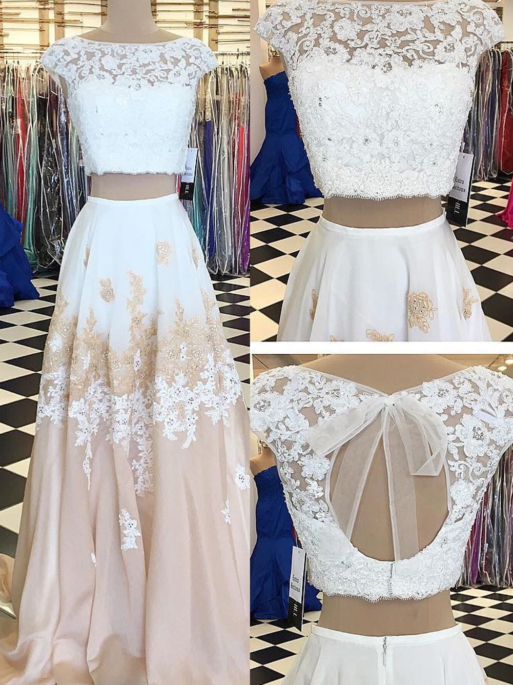 two piece white applique prom dresses women dresses,applique tulle lace short sleeves evening dress,SB0489