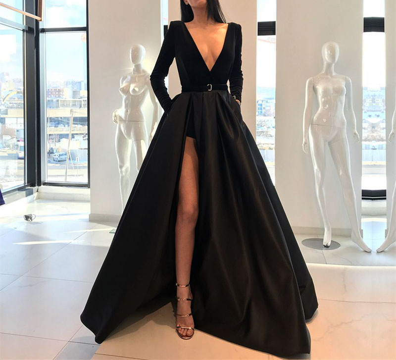 black long sleeves prom dress women dress fashion dress,v-neck slit-skirt satin evening dress,SB0510